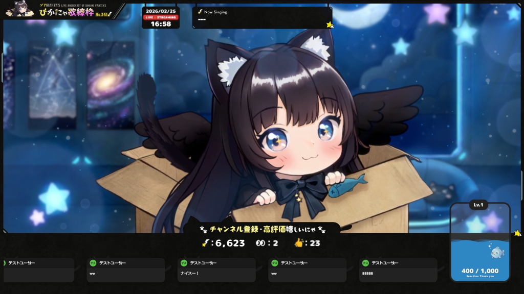 🧰ReactionMeter 2026/02/252026/04/04 この記事は約1分で読めます。 目次 v2:2026/4/4v1:2026/2/25🐾仕様 v2:2026/4/4 お魚アニメ:済@4/4 v1:2026/2/25 🐾仕様 メーターが上がると下からふわっとキラキラ リアクションが水槽の中ふわふわ🧡、🎉、💯、顔:上に上がっていく 普通のコメント:+10pt スパチャ、ステッカー:200pt※200pt+10%にした ギフトは、判定が分からないので受け取りlog(通常コメント)で+でいいかな… Lvが上がるとお魚増える🐟 ̖́-※そのうちお魚調整する