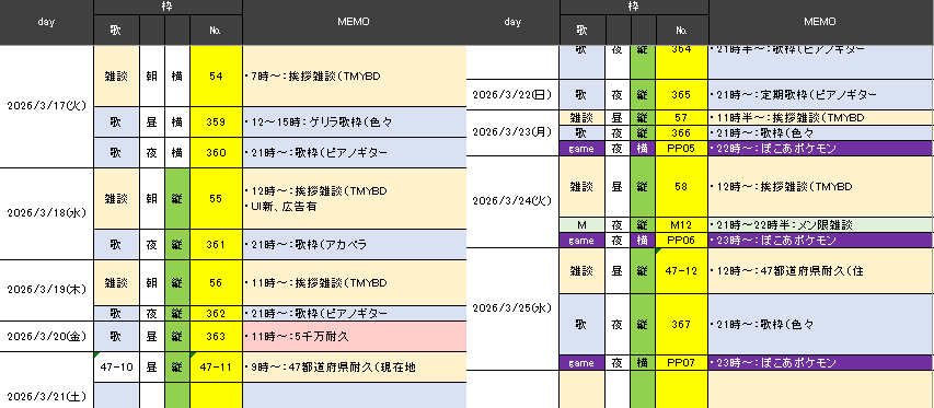 - メン限 雑談枠:2回(M11~12)