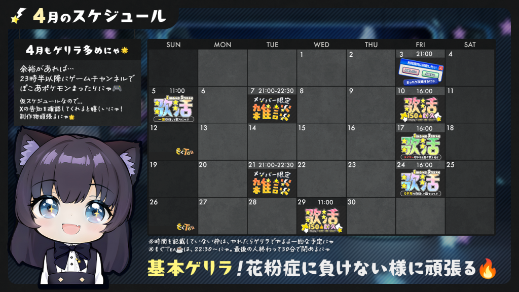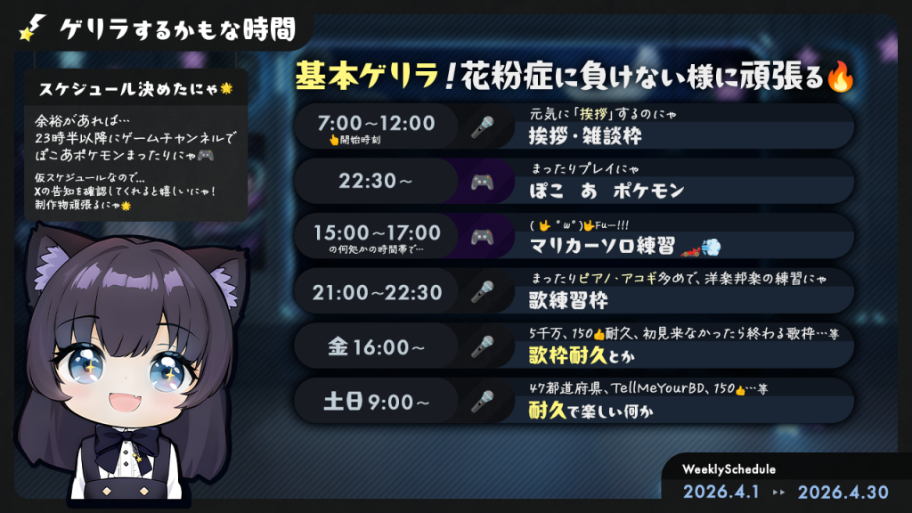 花粉症落ち着くまでは、歌枠耐久はしないでおこうかにゃ…